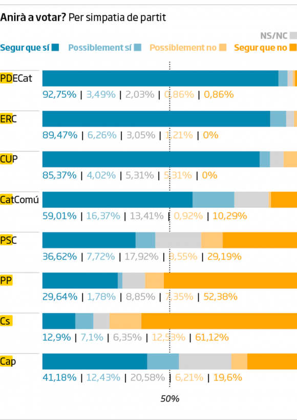 Sin embargo, la voluntad de acudir a votar es mucho mayor entre los independentistas:
