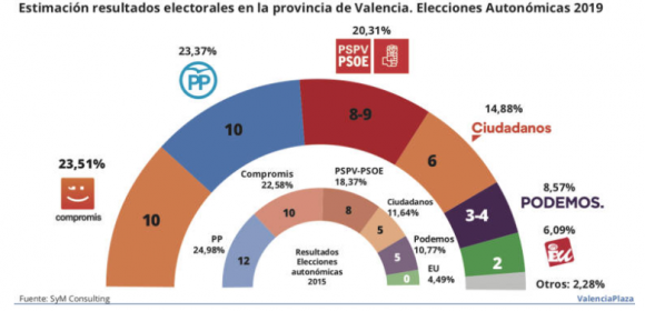 Encuesta de SyM para Valencia Plaza y Alicante Plaza para las elecciones autonómicas en la comunidad valenciana. La encuesta introduce cambios, con un empate técnico entre Compromís y el Partido Socialista, subida de Ciudadanos, bajada del PP y reajuste dentro de Unidos Podemos a favor de IU y en contra de Podemos.