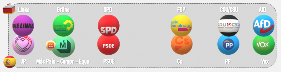 Hemos buscado, para cada partido alemán, el partido español que nos parece más cercano por ideología o puntos de vista (sabemos que es discutible, pero algún criterio hay que tener), y le hemos asignado el porcentaje de voto que consiguió en las últimas elecciones alemanas.