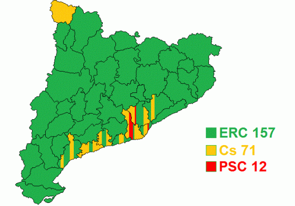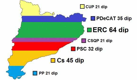 El Parlament de Catalunya tras la independencia estaría cómodamente dominado por ERC, que coparía todo el centro y el norte del país. Ciudadanos ganaría el escaño de Arán y también muchos de la zona costera situada entre Barcelona y Tarragona, donde ERC tendría una presencia notable pero algo inferior. En los distritos más obreros del extrarradio barcelonés el PSC cosecharía unos pocos escaños. Ningún partido más estaría en disposición de lograr escaños. Es el peaje que se paga en los sistemas mayoritarios: en cada distrito the winner takes it all, así que ser segundo (como le ocurriría al PDeCAT y a los comunes en muchos sitios) no da derecho a ningún asiento.