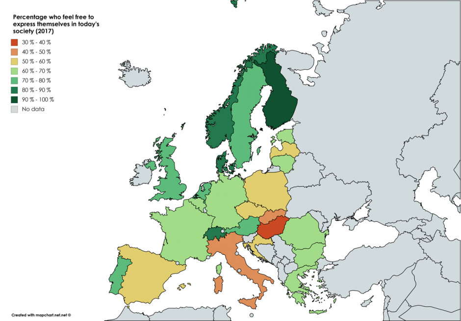 Partimos de los datos de Fondapol.org sobre la percepción que los ciudadanos de cada país europeo tienen sobre su propia libertad de expresión: