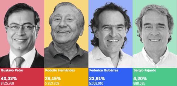 Gustavo Petro, candidato del Pacto Histórico fue el ganador de la primera vuelta con 8.527.768 votos lo que representa el 40.32%, mientras que en el segundo lugar estuvo Rodolfo Hernández de la Liga de Gobernantes Anticorrupción con el 28.15% representando en 5.963.209. El tercer lugar fue para Federico Gutiérrez del Equipo por Colombia con 5.058.010. Además, 366.623 personas votaron en blanco.