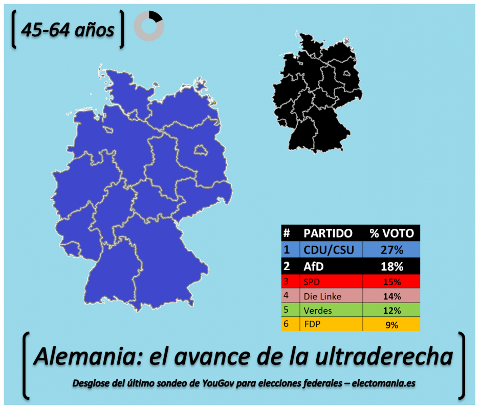 Entre los adultos de mediana edad las cifras hablan por sí solas: aunque el partido de Merkel lidera, la ultraderecha se sitúa por encima del 20% quedándose a cinco puntos de la primera plaza entre los 25 y los 44 años. Destaca también la igualdad de preferencia entre SPD y Die Linke, mientras los liberales del FDP son la fuerza menos apoyada.