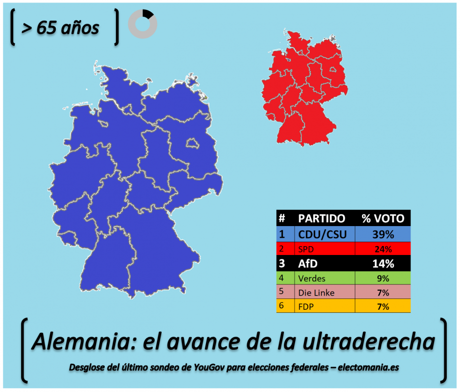En la franja de los jubilados, no hay novedades. Los alemanes de más de 65 años prefieren la seguridad de los partidos tradicionales, con Merkel como candidata preferida y su CDU/CSU arrasando con casi el 40% frente al poco más del 20% del SPD, que ve como logra la segunda posición únicamente en este segmento de la población. La ultraderecha se sitúa tercera, aunque a distancia de las dos primeras opciones.