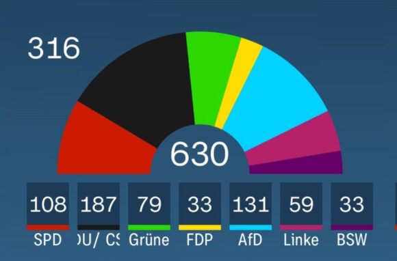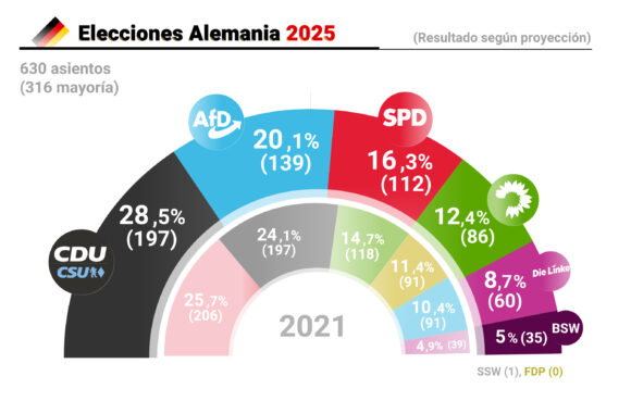 Mientras tanto, el bloque conservador CDU/CSU ha logrado un repunte con 211 escaños, consolidándose como la fuerza mayoritaria, aunque sin capitalizar el descontento con el gobierno. El crecimiento más llamativo ha sido el de la AfD, que se dispara hasta los 142 escaños, reflejando una fuerte ola de apoyo a la extrema derecha. Este ascenso coincide con un declive progresivo de Los Verdes, que bajan a 98 escaños, mostrando que su auge electoral de 2021 no se ha sostenido.