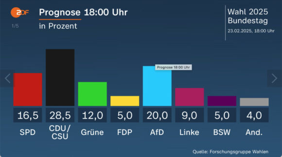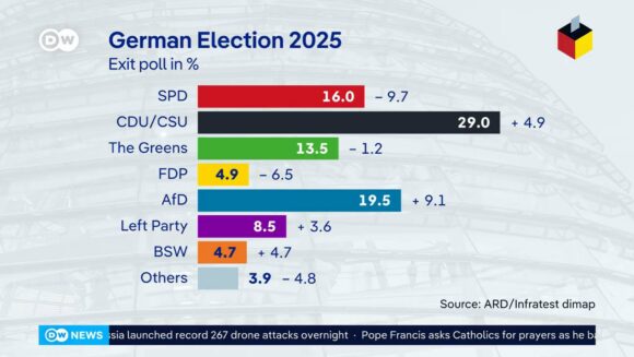 Las elecciones federales de 2025 en Alemania han reflejado un cambio drástico en la correlación de fuerzas políticas. Según las encuestas a pie de urna (Exit Polls), el partido de ultraderecha AfD ha experimentado un crecimiento explosivo de +9,1 puntos, consolidándose como una de las principales fuerzas políticas del país. Al mismo tiempo, la CDU/CSU se ha recuperado notablemente con un ascenso de +4,9 puntos, marcando un retorno del electorado conservador tras años de desgaste. Otro fenómeno destacado es la irrupción de BSW (Bündnis Sahra Wagenknecht), que logra un avance significativo de +4,7 puntos, absorbiendo parte del voto de izquierda descontento con los partidos tradicionales.