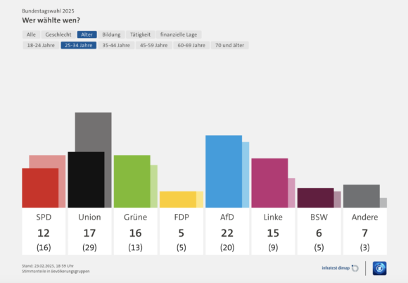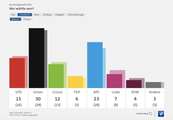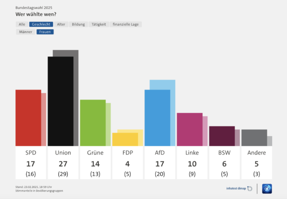 Las elecciones también han reflejado disparidades en el voto por género. AfD ha obtenido un mayor respaldo entre los hombres (23%), mientras que entre las mujeres ha caído al 17%. Por otro lado, Los Verdes han registrado mejores resultados entre las mujeres (14%) que entre los hombres (12%), lo que sugiere una mayor inclinación femenina hacia políticas progresistas y ecologistas.