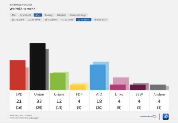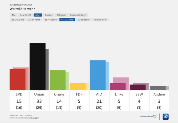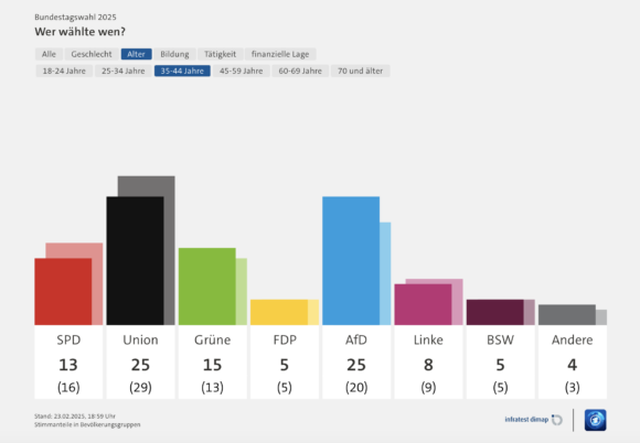 Los resultados muestran cómo el voto juvenil se distancia de las opciones convencionales: Los Verdes también han tenido un apoyo considerable en la franja de 25 a 34 años (16%), mientras que los votantes de 45 a 59 años han favorecido en mayor medida a la CDU/CSU (33%) y AfD (21%).