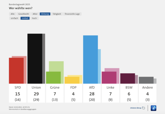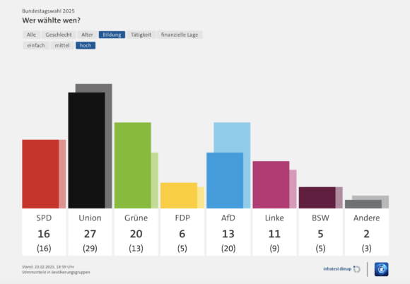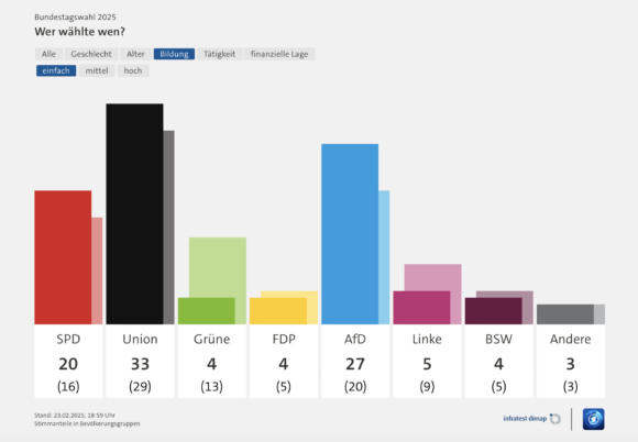 Esto confirma una tendencia ya observada en elecciones anteriores: los votantes con menor nivel educativo tienden a optar por opciones conservadoras o populistas, mientras que los sectores con mayor nivel de formación se inclinan por alternativas progresistas o ecologistas. La CDU/CSU se mantiene fuerte en todos los segmentos educativos, con un 27% de apoyo en el grupo con educación superior.