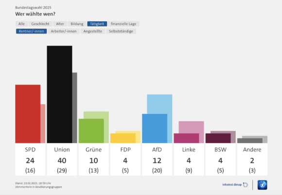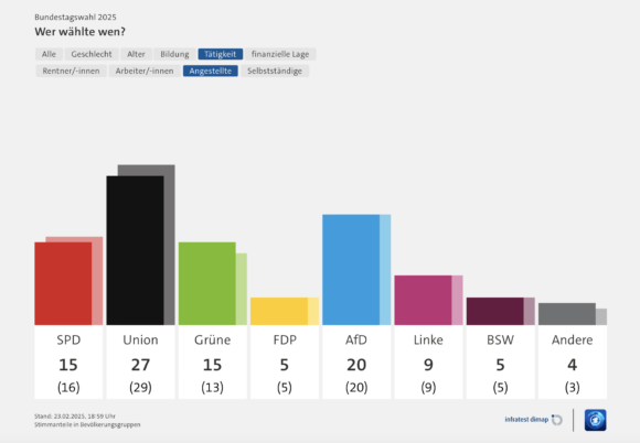 Los jubilados han mantenido su apoyo a los partidos tradicionales: CDU/CSU ha obtenido el 40% del voto en este segmento, seguido del SPD con un 24%. Por otro lado, el voto entre los empleados ha sido más diverso, con la CDU/CSU a la cabeza (27%), pero con una presencia significativa de Los Verdes (15%) y AfD (20%).