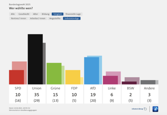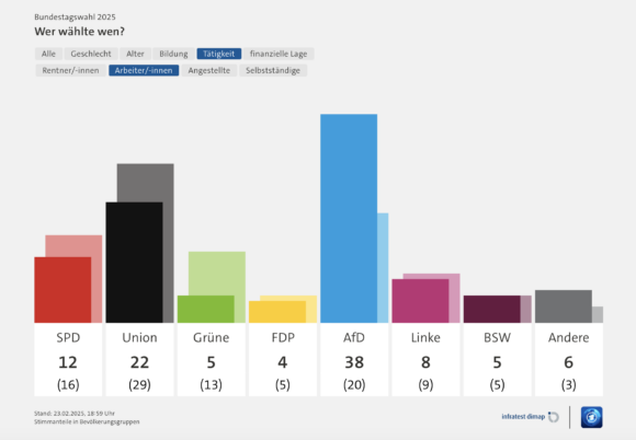 El tipo de ocupación también ha marcado diferencias notables en el voto. Entre los autónomos, la CDU/CSU ha sido la fuerza dominante (35%), seguida del FDP (10%), partido que ha perdido fuerza respecto a comicios anteriores. Entre los trabajadores, en cambio, AfD ha sido el partido con mayor respaldo (38%), superando incluso a la CDU/CSU (22%).