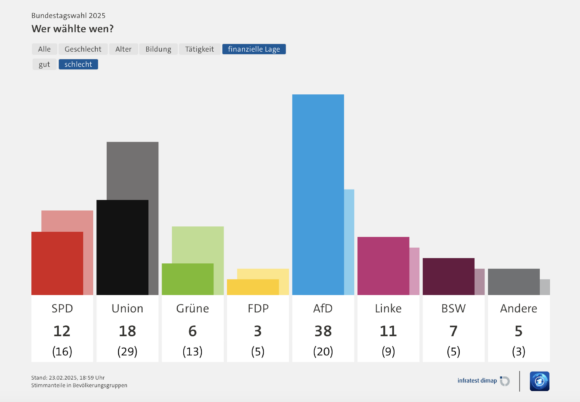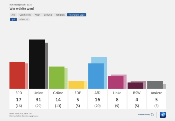 La situación económica de los votantes ha generado también una fractura electoral. Entre quienes consideran que su situación financiera es buena, la CDU/CSU ha sido la opción preferida (31%), seguida de Los Verdes (14%). Por el contrario, entre los votantes con una situación económica mala, el apoyo a AfD ha sido abrumador (38%), consolidando su papel como partido de protesta frente al descontento social.