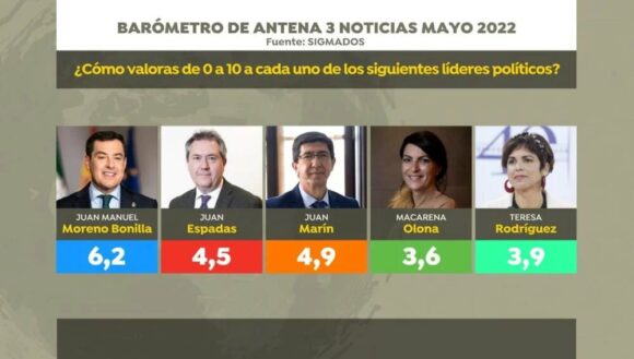 Desglose de valoración de los líderes andaluces difundida por Antena 3, correspondiente al sondeo de Sigma Dos: