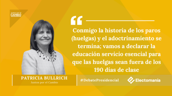 Patricia Bullrich prometió bajar la inflación y recuperar el empleo. Entre otros, comentó “conmigo la historia de los paros (huelgas) y el adoctrinamiento se termina; vamos a declarar la educación servicio esencial para que las huelgas sean fuera de los 190 días de clase“.