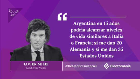 Javier Milei se centró en su propuesta de dolarización de la economía y en la reducción del gasto público. Dijo que “Argentina en 15 años podría alcanzar niveles de vida similares a Italia o Francia; si me dan 20 Alemania y si me dan 35 Estados Unidos“.
