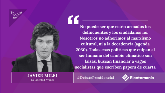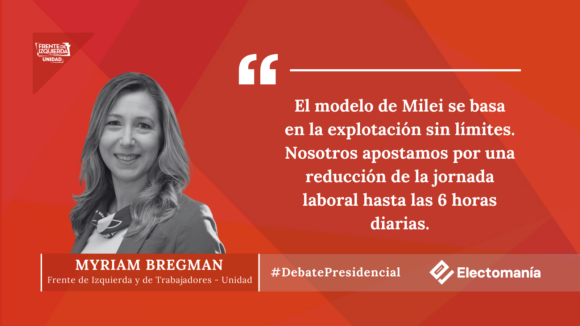 Por su parte, Javier Milei y la candidata del Frente de Izquierdas, Myriam Bregman, tuvieron una fuerte discusión sobre la propuesta de Bregman de reducir la jornada laboral a seis horas diarias, algo con lo que Milei bromeó llegando a decir que sería algo tan “maravilloso” como modificar la ley de la gravedad.