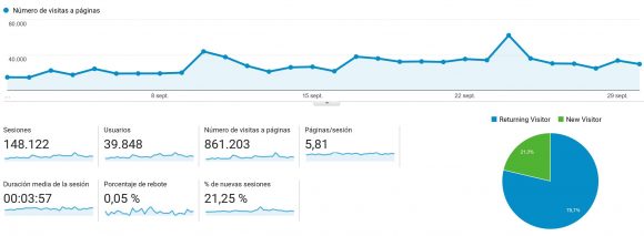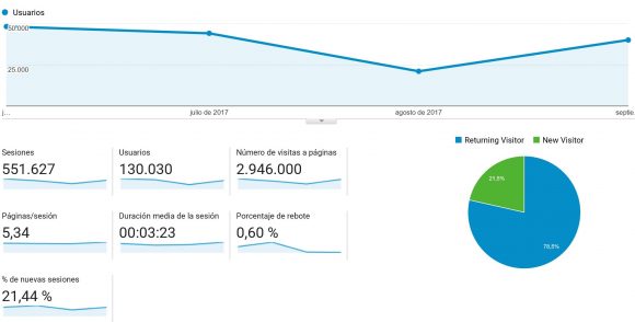 Nos gustaría compartir con vosotros los datos del tráfico correspondiente al mes de Septiembre de 2017. Este pasado mes se observa una recuperación de usuarios con respecto a los meses de julio y agosto, alcanzando los 38K usuarios únicos.