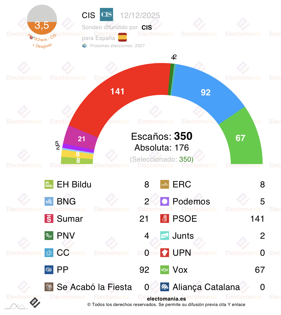 Barómetro mensual del CIS dirigido por José Félix Tezanos para elecciones generales en España. Precaución, PollCheck bajo, tomar con cautela.