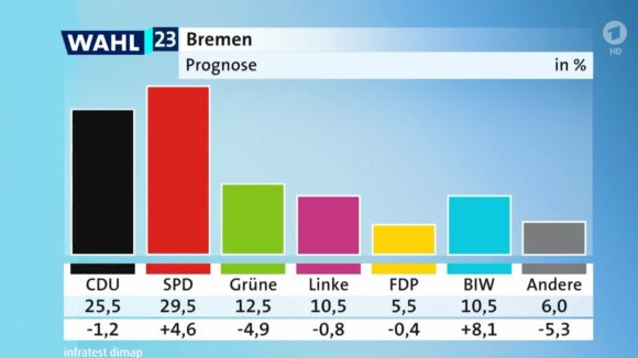 Los pronósticos a cierre de urnas en Bremen apuntan a una victoria de los socialdemócratas, que superan en más de 3p a la CDU, mientras los verdes mantienen la tercera posición.
