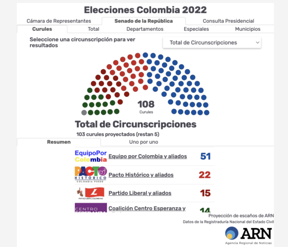 Respecto a la renovación de curules, pese a que el conservador Equipo Por Colombia sigue teniendo un importante peso, ha sido el izquierdista Pacto Histórico quien ha capitalizado gran parte de los asientos. El partido de Petro se sitúa como primera fuerza en el Senado. Estos han sido los resultados: