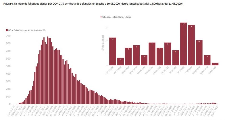 También sube la incidencia de la última semana de personas con síntomas iniciados en ella, y el número de fallecidos en los últimos 7 días, que pasa de 64 a 65. Aragón reporta 23 de esos fallecimientos. El número total de fallecidos reportados ayer por el ministerio era de 28.581 mientras que hoy es de… 28.579, lo cual evidencia la inconsistencia de algunas cifras y las continuas correcciones que se realizan al encajar datos muy dispersos de 19 fuentes diversas.