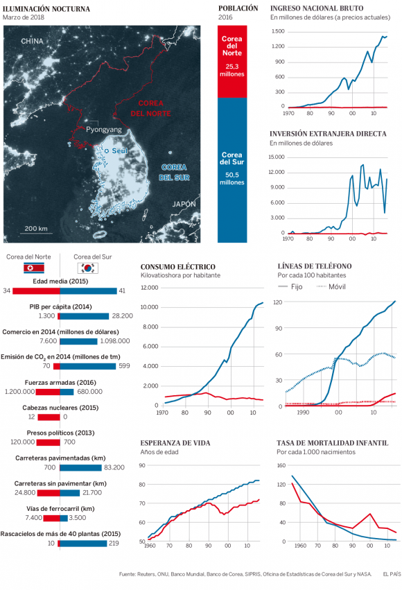 Las dos Coreas llevan años enfrentadas en todos los aspectos, siendo adalid de dos regímenes de Gobierno totalmente dispares con grandes diferencias entre ellas en lo que respecta a sus ciudadanos, como reflejan los datos recogidos por El Pais en esta infografía:
