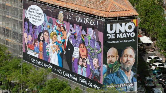 El partido Vox ha llevado a cabo una acción publicitaria en el centro de Madrid con motivo del próximo Primero de Mayo, Día Internacional de los Trabajadores. En concreto, han desplegado una gran lona en el cruce de la calle Alcalá con O’Donnell en la que se representa una boda ficticia entre el presidente del Gobierno español, Pedro Sánchez, y la vicepresidenta segunda, Yolanda Díaz, oficiada por el exministro del PP, José Manuel García-Margallo.