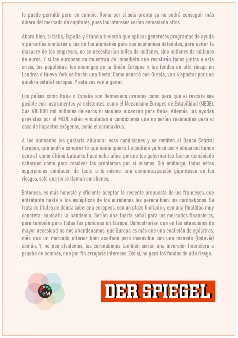 Der Spiegel, la revista 📰 de mayor difusión en Alemania, publica un duro editorial afeando 👎 la posición de Merkel y los países del bloque ‘nórdico’ contra los eurobonos. “El rechazo alemán de los eurobonos es insolidario, mezquino y cobarde”.