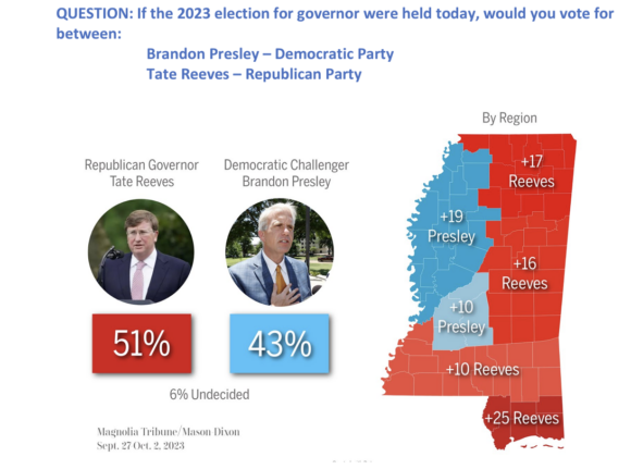 En Mississippi, el gobernador republicano Tate Reeves se enfrenta al representante demócrata Brandon Presley. Reeves, que ganó las elecciones de 2019 por un margen de 10 puntos, ha centrado su campaña en la economía y la seguridad pública. Presley, por su parte, ha criticado la gestión de Reeves en temas como la educación y la salud.