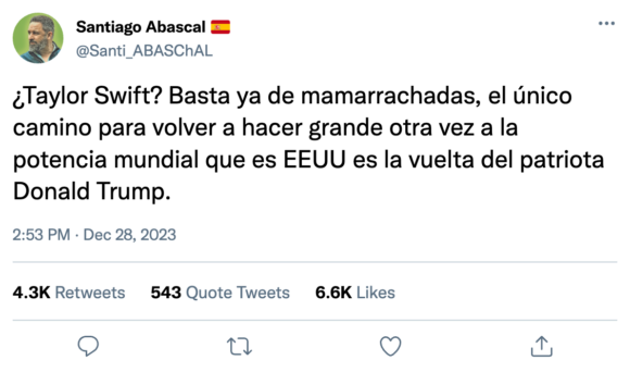 Santiago Abascal, líder de Vox , ha calificado de ‘mamarrachada’ la candidatura de Swift.
