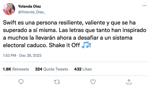 Yolanda Díaz, dirigente de Sumar ➕, ha destacado las cualidades de Taylor a quien califica como resiliente, a la vez que ha tachado de ‘caduco’ el sistema bipartidista americano.
