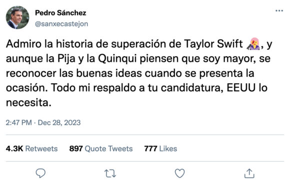 Pedro Sánchez ha respaldado la candidatura de Swift acordándose de su paso por ‘la Pija y la Quinqui’, ¿pronto juntos en Falcon?