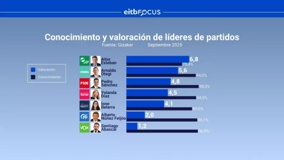 En la valoración de dirigentes políticos, Aitor Esteban (PNV) obtiene la puntuación más alta, con un 6,8 sobre 10, y es conocido por el 75% de la población. Le sigue Arnaldo Otegi (EH Bildu), con un 5,6 y un nivel de conocimiento del 94%.