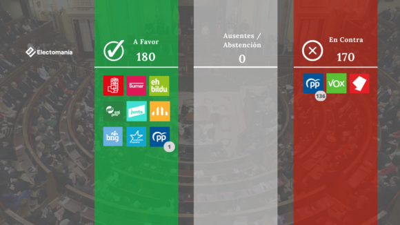 Además de los grupos proponentes -PSOE, Sumar, ERC, Bildu, PNV y BNG– la han apoyado Junts y Coalición Canaria. También ha votado a favor una diputada del PP, Rosa Quintana Carballo, electa por Ourense, en su caso por error. No ha habido abstenciones.