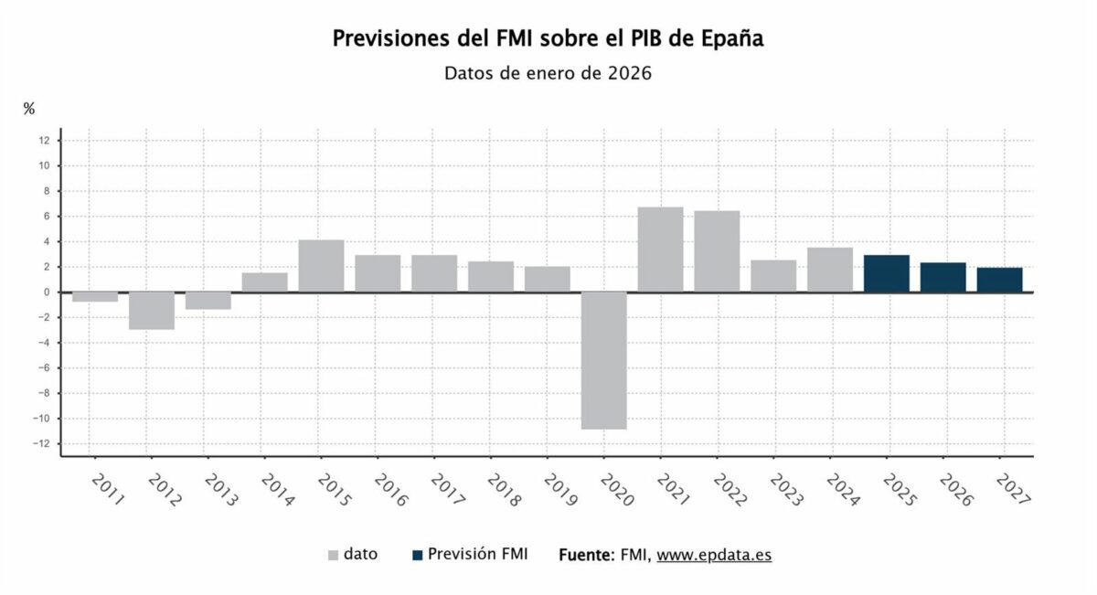 El Fondo Monetario Internacional (FMI) ha vuelto a revisar al alza sus expectativas de crecimiento para la economía española tanto para este año como para el siguiente, con un ritmo de expansión previsto del 2,3% en 2026, tres décimas más de lo anticipado el pasado mes de octubre, y del 1,9% en 2027, lo que implica una mejora de dos décimas respecto del último pronóstico de la institución con sede en Washington.