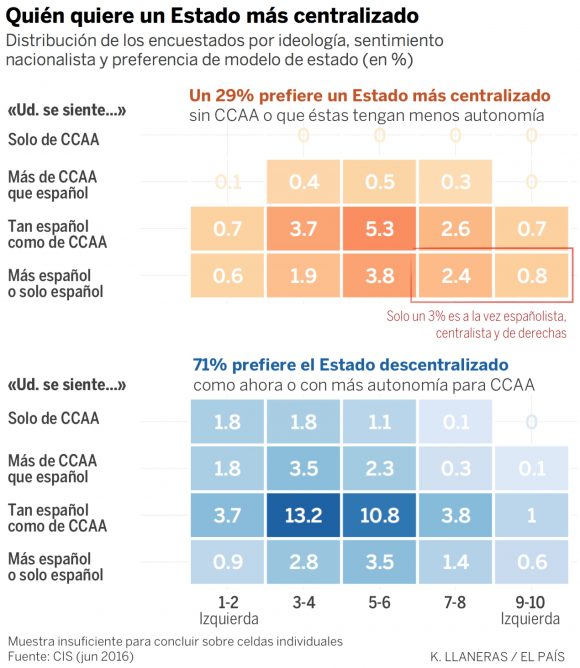 Análisis de datos del CIS de Kiko Llaneras para el diario El País publicada hoy, que recoge el sentimiento nacionalista español y las preferencias de Estado por ideología y en conjunto.