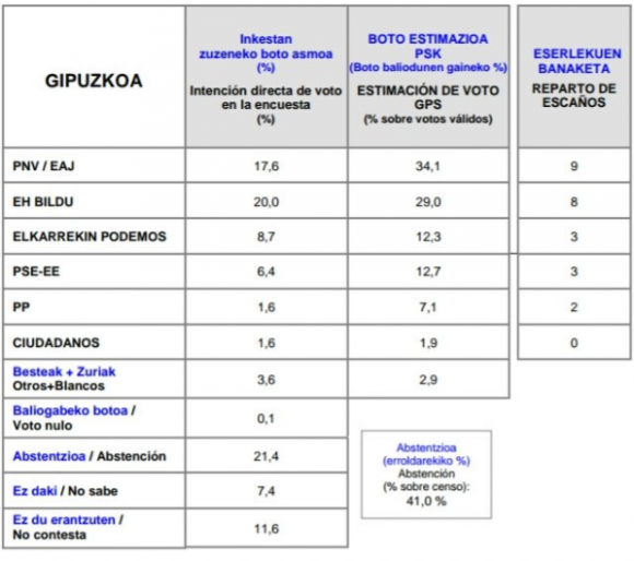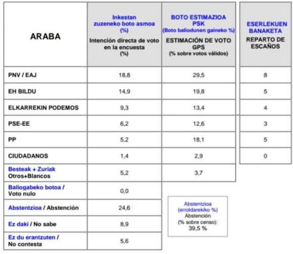 El Gabinete de Prospección Sociológica del Gobierno Vasco ha hecho público su estudio de finales de octubre. En él, el Parlamento Vasco tendría una composición idéntica al actual, con la única diferencia de que el PNV gana un escaño a costa de Elkarrekin Podemos.