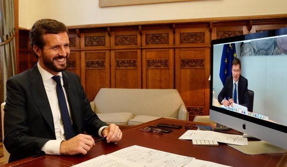 El líder del PP, Pablo Casado, mantiene una reunión por videoconferencia con el vicepresidente de la Comisión Europea y comisario del Euro y Diálogo Social, Valdis Dombrovskis.