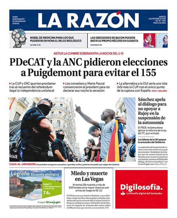 El diario La Razón lleva mañana en su portada que el PDeCAT y la ANC pidieron a Puigdemont que convocara elecciones para evitar el 155. Según la información publicada por La Razón, ERC y la CUP habrían pedido tras el recuento al President que declarase la independencia esa misma noche, pero la intervención de los consellers y de Marta Pascal lo habríam evitado.