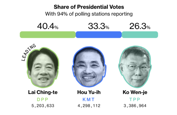 El actual vicepresidente de la isla se impone con un 40% a los aspirantes opositores del Kuomintang (KMT), Hou Yu-ih, que tiene un 33% de los votos, y del Partido Popular de Taiwán (PPT), Ko Wen-je, que cuenta con un 26%.