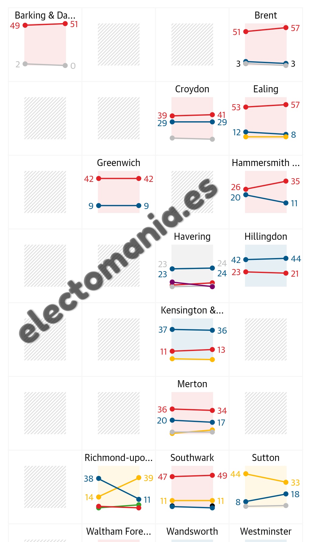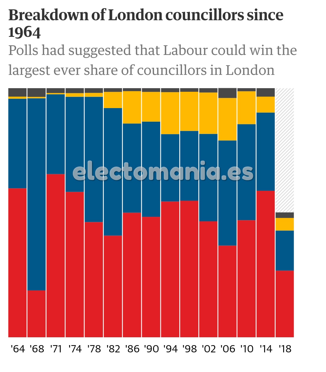 Y este es el histórico de votación en Londres, aún pendiente de acabar el escrutinio para ver si finalmente los Laboristas consiguen su mejor resultado histórico: