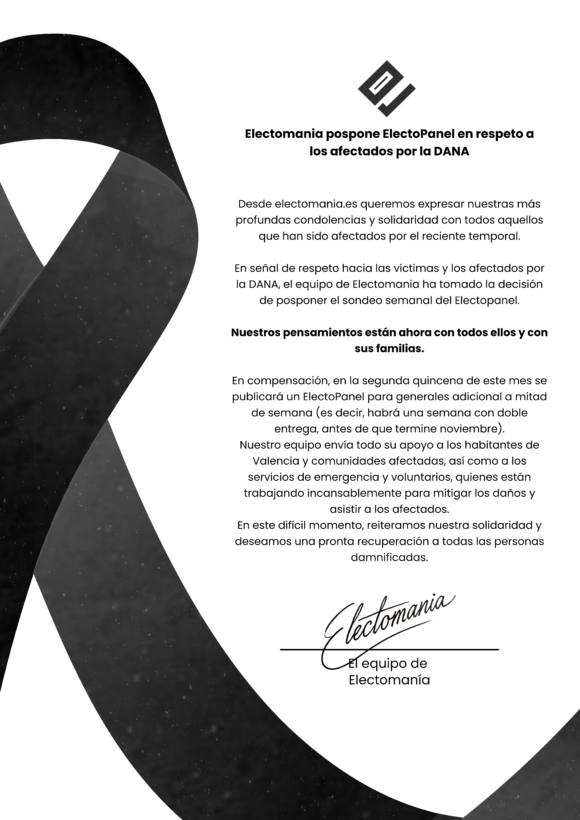 En señal de respeto hacia las víctimas y los afectados por la DANA, el equipo de Electomania ha tomado la decisión de posponer el sondeo semanal del Electopanel.