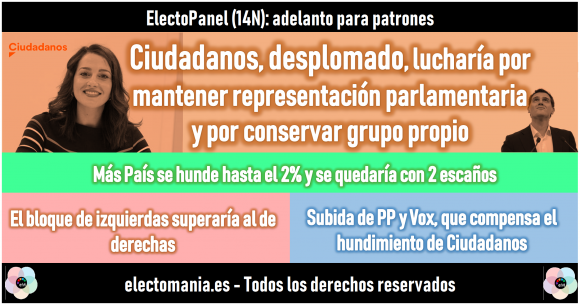 Beneficios exclusivos: Acceso completo: adelanto de los paneles horas antes de su publicación en abierto, panel para generales: (desglose de escaños y voto por provincias y partidos, mapa del partido ganador por provincias), electoPanel autonómico quincenal exclusivo, sección exclusiva para Patrones en El Foro y electoPanel especial VIP mensual exclusivo.