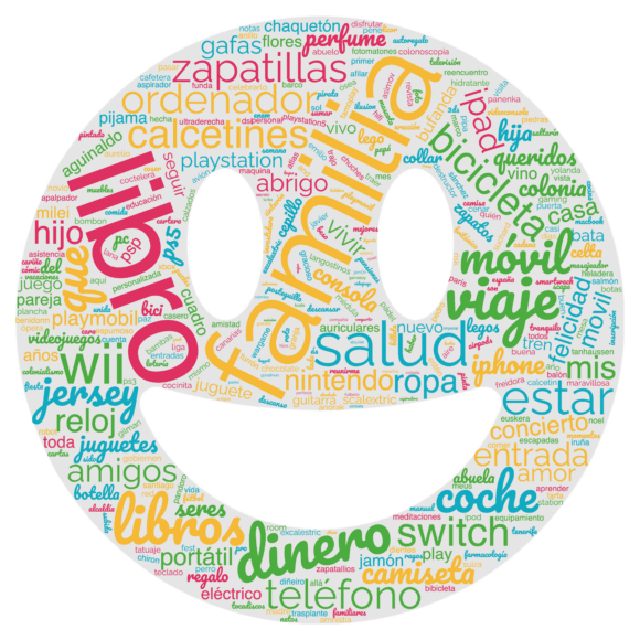 Productos como “iPhone” y “Switch” se destacan, subrayando la tendencia hacia regalos de alta tecnología. Artículos para el hogar, como “bici” y “coche”, sugieren que regalos prácticos y de gran valor también son altamente estimados. Además, palabras como “amor”, “amigos” y “familia” sugieren que los regalos que fortalecen relaciones personales son especialmente valorados.