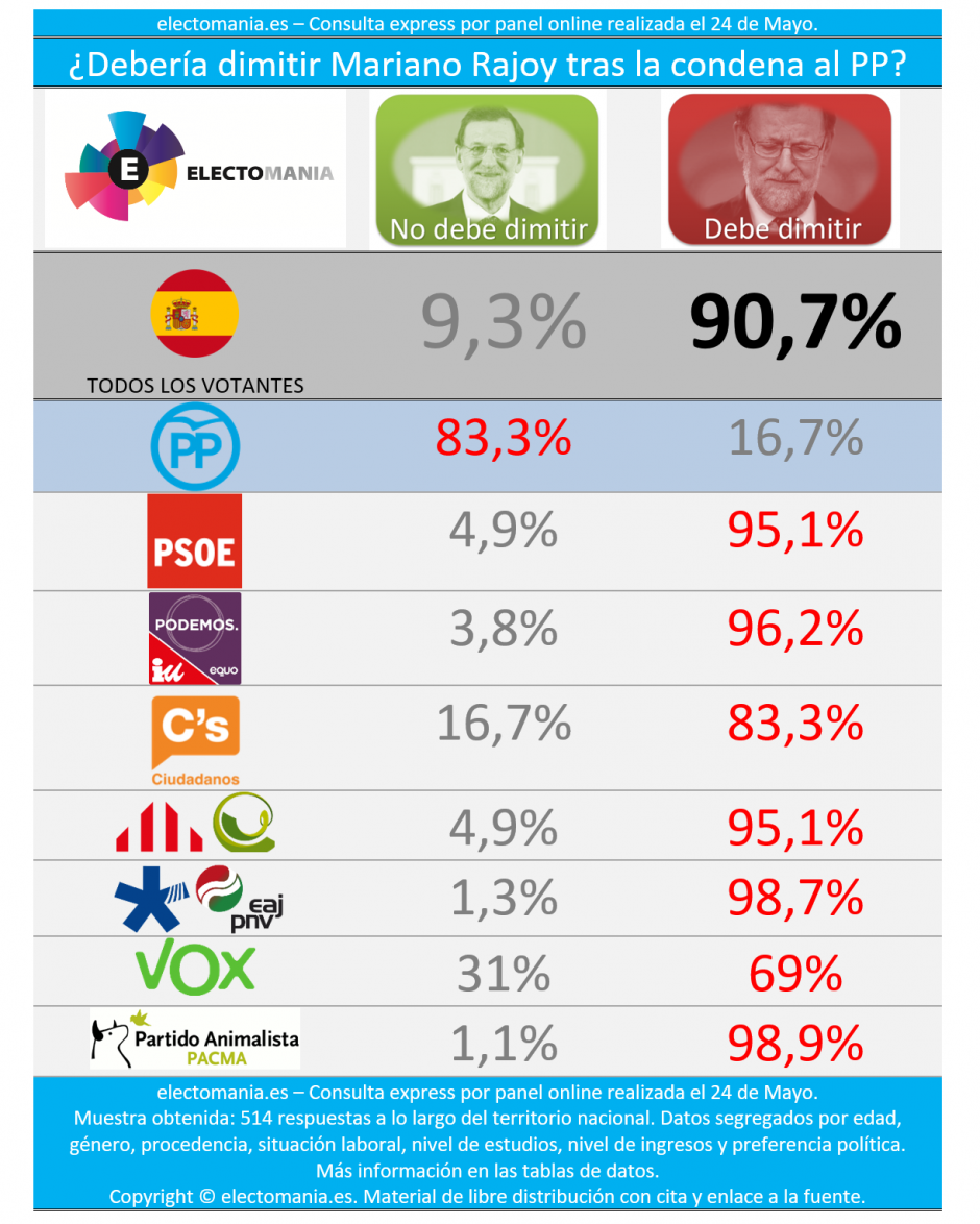 Los datos son demoledores para el Partido Popular: un 90% de los votantes opina que Mariano debe dimitir tras la sentencia del caso Gürtel, siendo únicamente los populares quienes apuestan porque Rajoy continúe al frente del Ejecutivo. El resto de partidos prefiere que dimita, incluyendo a los partidarios de Vox (31%) y Ciudadanos (17%).