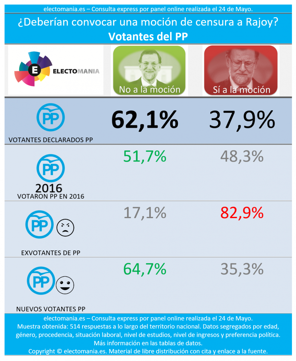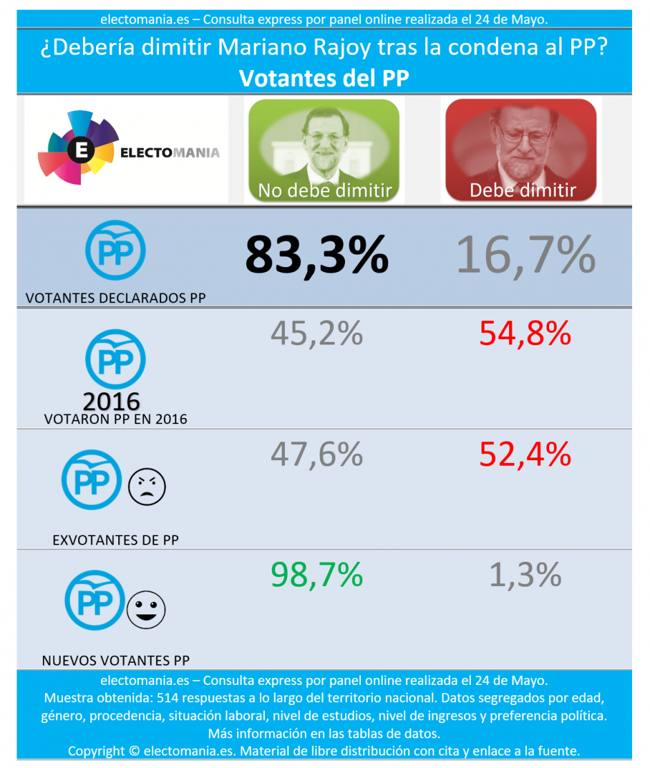 En el desglose de los votantes populares, se ve como los nuevos votantes del PP quieren en la práctica totalidad que Rajoy siga al frente del Gobierno mientras que los exvotantes creen necesario su reemplazo, ganando esta opción también entre quienes hace 2 años introdujeron la papeleta de los populares en la urna.