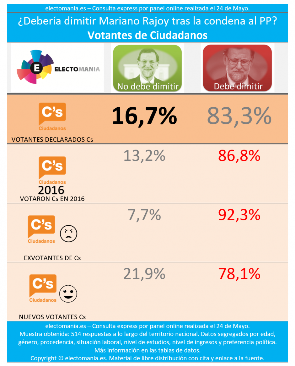 En el caso de Ciudadanos, sus votantes rechazan a Rajoy de forma mayoritaria, y es ese rechazo más acentuado entre quienes hace 2 años votaron a Rivera y ahora cambiaría de partido.