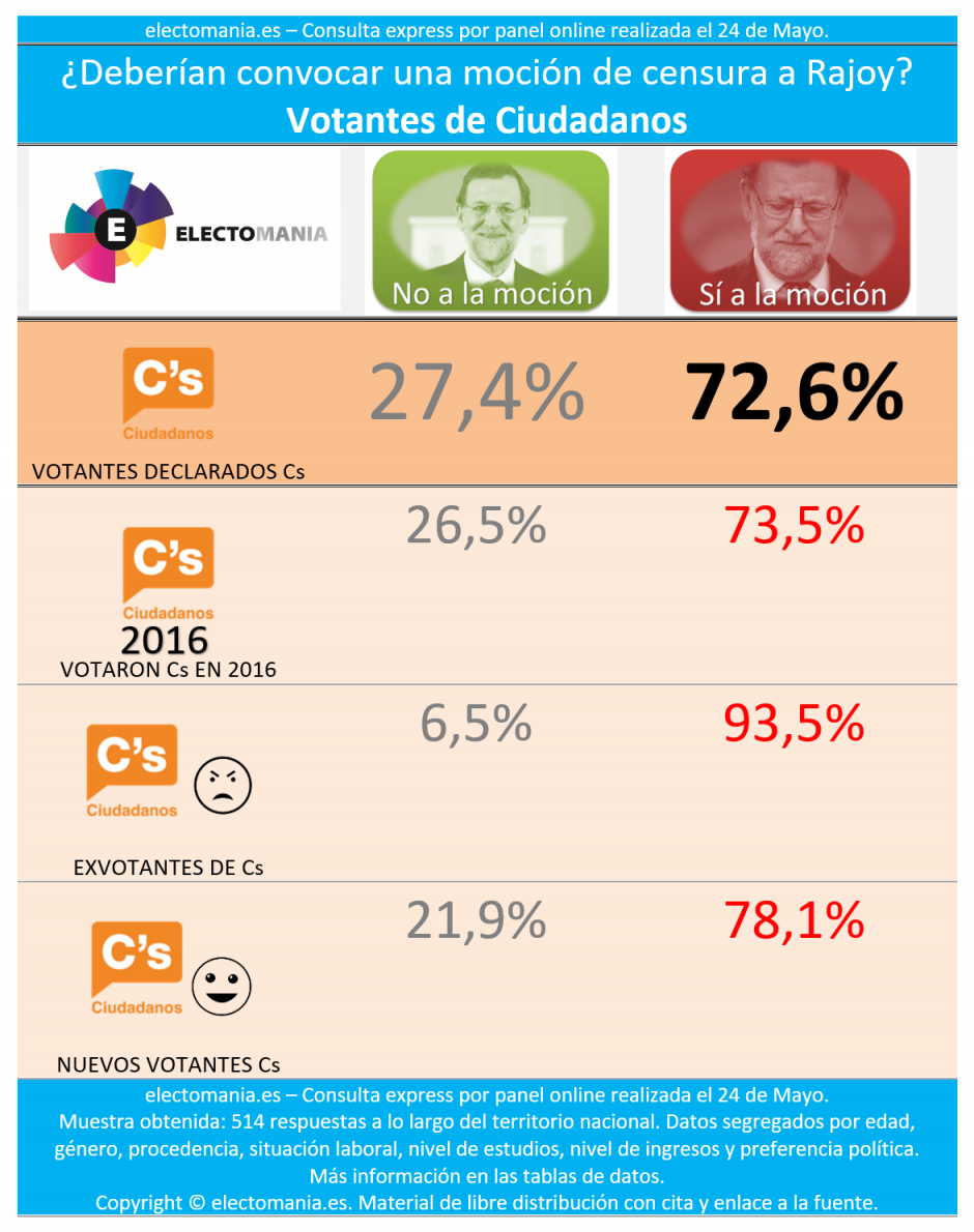Los votantes de Ciudadanos creen que deben hacer una moción de censura, si bien son sus exvotantes quienes más apoyan su destitución, superando el 90%.