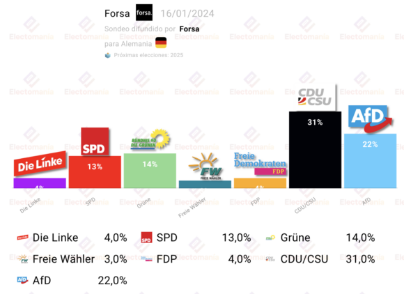 Hoy se han publicado dos encuestas para elecciones federales en Alemania, de distintas encuestadoras, que apuntan a un fuerte desgaste de los partidos de la coalición de gobierno.