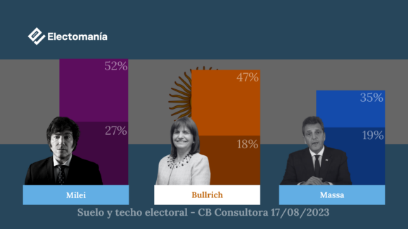 Así, Javier Milei es el mejor situado, ya que parte de valores seguros más altos y tiene mayor margen de personas dispuestos a votarle. Le siguen Bullrich y Massa, en niveles similares de suelo, aunque con peores perspectivas de techo para el peronista.